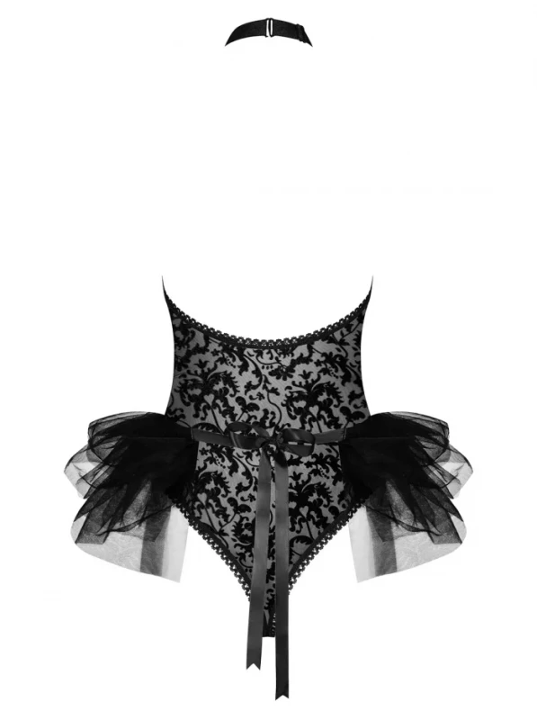 Боди выполнено из эластичного плотного материала с изумительным цеточным узором. Идеально садится по фигуре, подчеркивая формы в самом лучшем свете! Оголенная спина повышает градус возбуждения, а соблазнительные ягодицы не позволяют отвести от Вас взор! Надевается боди через шею